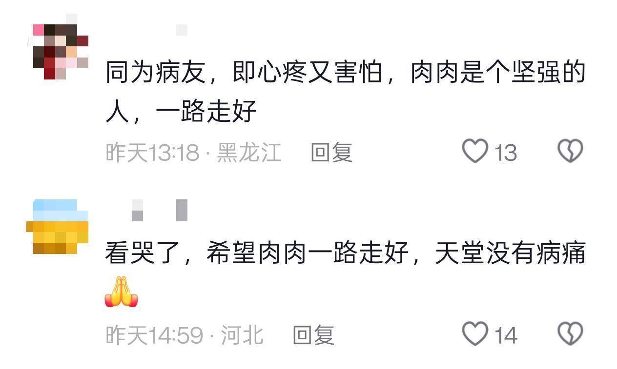 “肉肉”的男朋友表示:“感谢大家对‘肉肉’的关心和支持,她再也不用经受疼痛折磨了,可以躺下好好休息了。希望下辈子我们早点相遇,一定要嫁我为妻,你只负责开心快乐就好。”